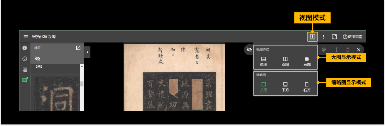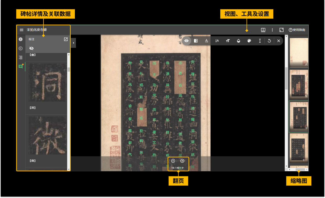 用户通过单字欣赏页及碑帖详情页均可进入碑帖大图浏览界面。界面主要功能区说明如下: