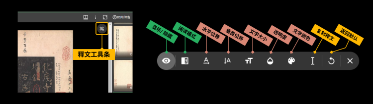 系统为包含释文信息的碑帖提供了释文辅助阅读及强大的自定义设置功能。用户浏览碑帖正文画面时,单字释文将默认呈现于相应文字上层。用户可通过右上角的工具条自定义释文样式、设置释文显示方式,或进行文字复制。