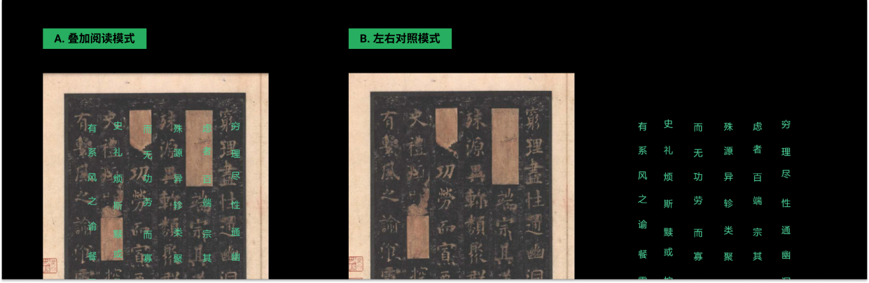 - 阅读模式:平台提供了叠加显示及左右对照两种阅读模式。默认显示为叠加阅读模式,用户可点击切换。