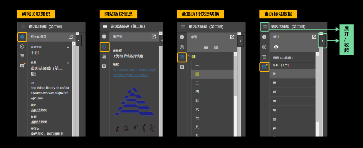 用户可点击左侧竖排按钮,切换查看关于碑帖的元数据知识、版权信息、碑帖页数列表及释文文字列表。